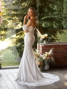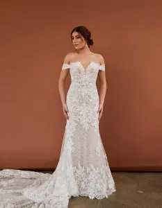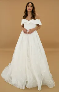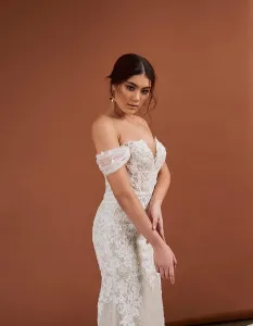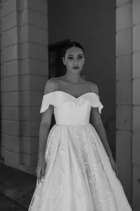 The wide collared off the shoulder seen on this Tina Holly gown embodies elegance and sophistication while still subtly remaining sexy and bold. This sleeve is both comfortable and allows plenty of movement, perfect for dancing on your special day.