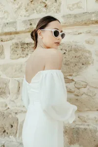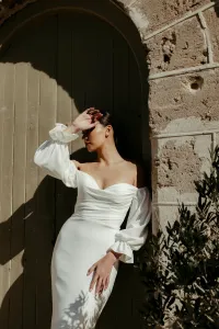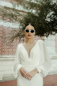 The off shoulder balloon sleeve. This sleeve is both playful and modern and creates a unique twist to any wedding gown. The sleeves are a statement piece yet are still simple enough to be paired with dramatic gowns. These sleeves also have the potential to be created from various materials and can match many different gowns fabrics and details seen by this Cizzy Bridal gown where the sleeves are made of the delicious crepe material.