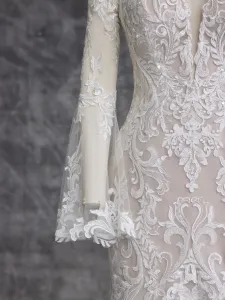 The flare sleeve is perfect for any bride looking for a bohemian or free and flowy style gown. This sleeve creates beautiful movement and body that is eye catching and playful. Saige by Maggie Sottero demonstrates how effortlessly this style can be added to a gorgeous lace gown.