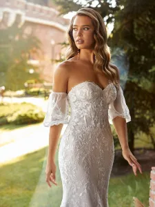 The removable puff sleeve. The Marlee gown by Maggie Sottero perfectly shows how effortlessly these sleeves can give your gown a chic and stylish touch and better yet can be easily removed to reveal a strapless gown allowing a whole new transformation on your look.