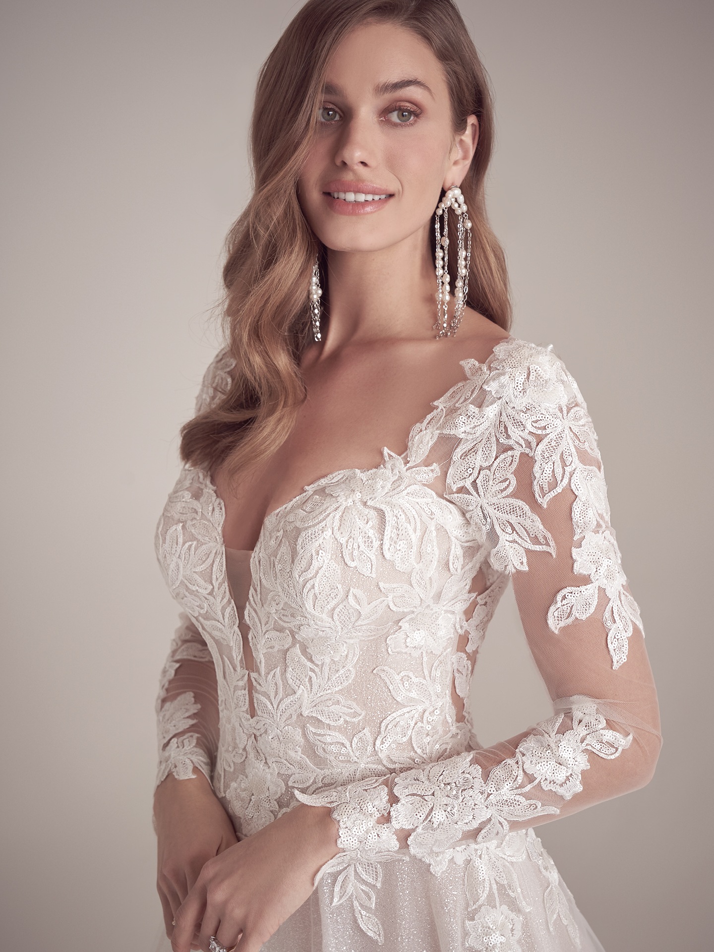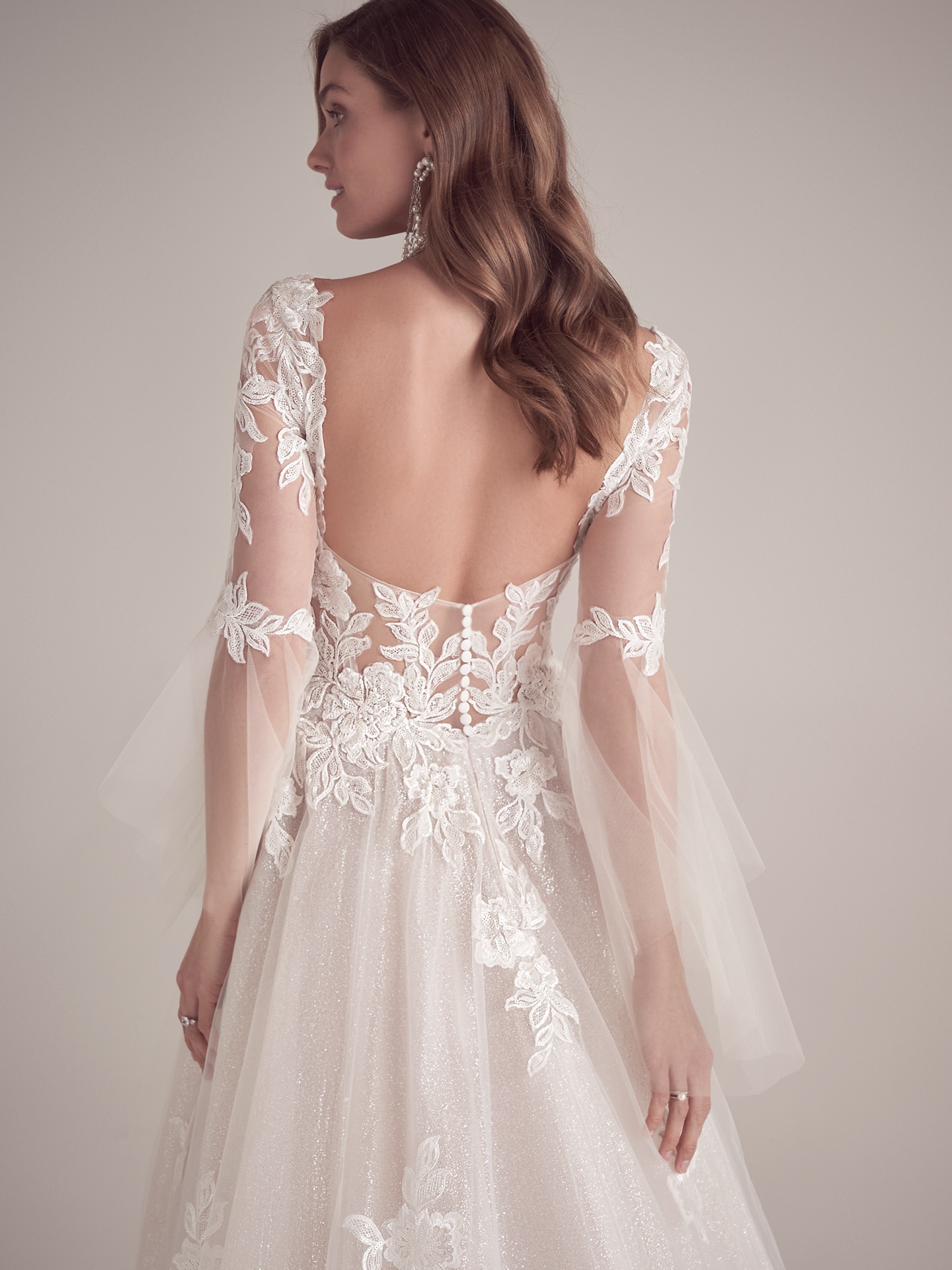 • Detachable illusion lace long bell sleeves sold separately