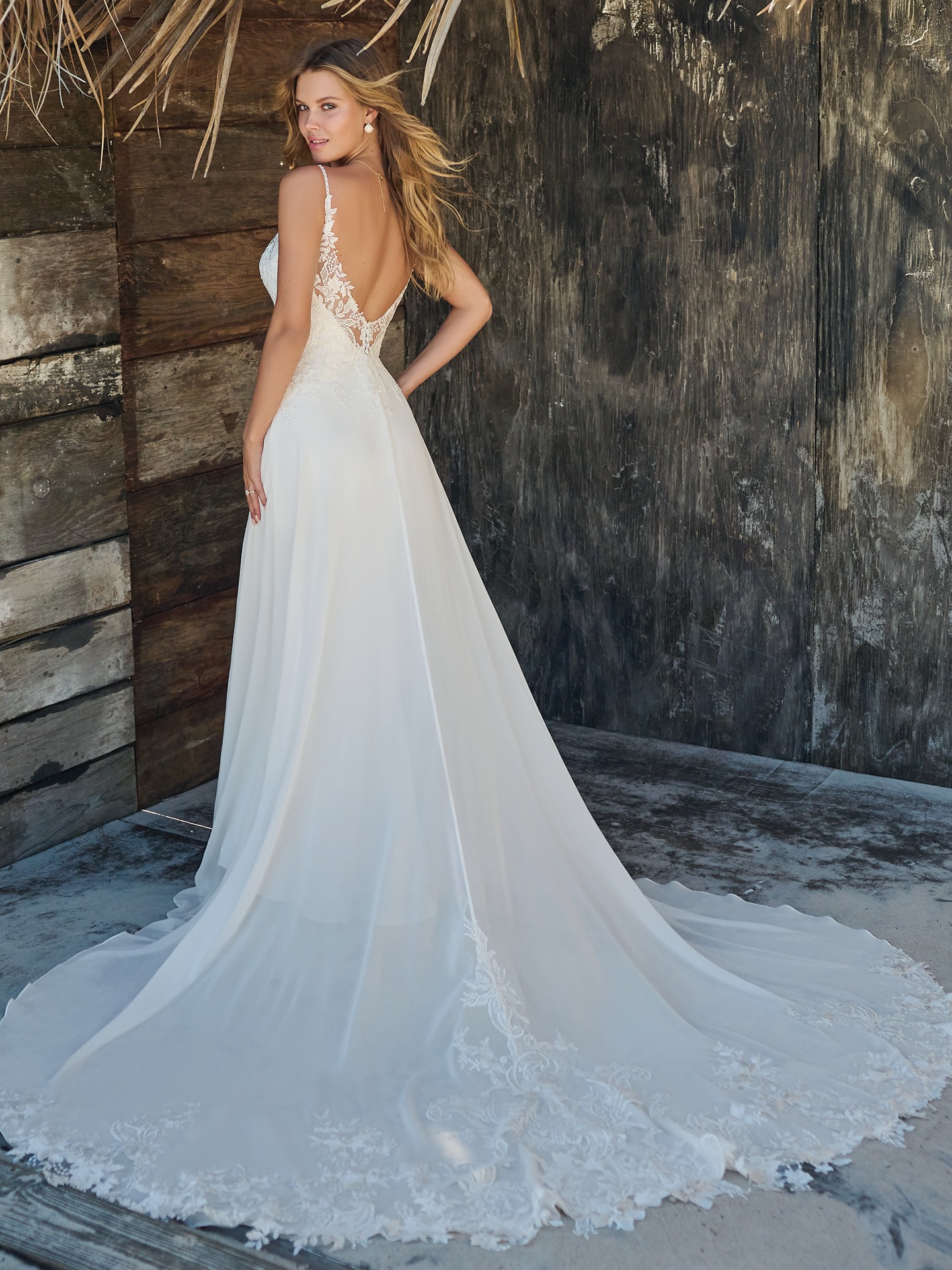 Illusion V-back casual chiffon bridal gown with beaded spaghetti straps